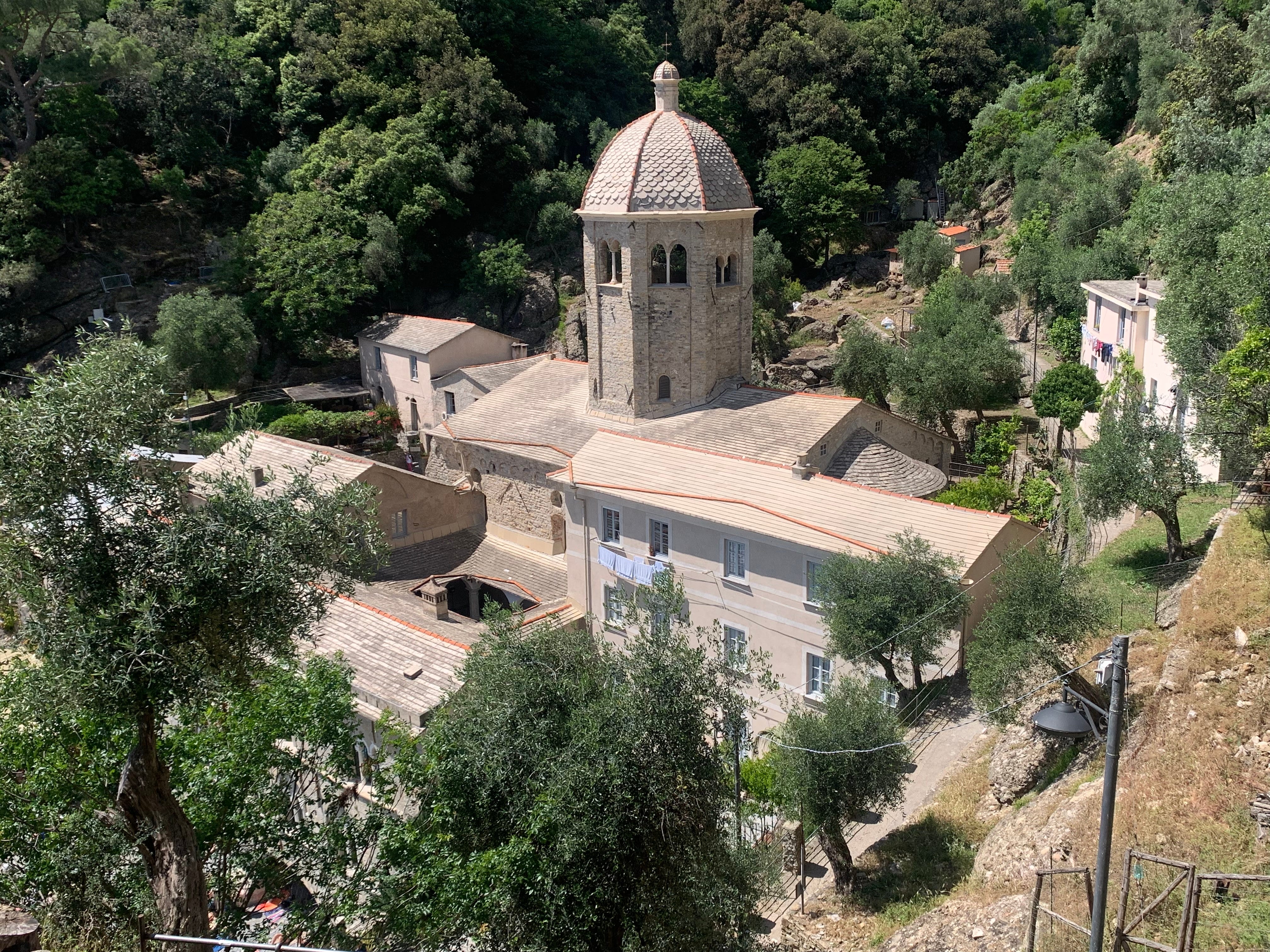 Enfin je l’aperçois, totalement inattendue et paradoxale. Un beau bâtiment de pierre claire, avec sa façade voûtée, les pieds plantés dans une petite plage, presque les pieds dans l’eau. Elle est lovée dans une minuscule crique, en contrebas de cette abrupte montagne: dans le golfe Paradiso. Mmmm … oui en effet, il y a ici un petit goût d’Eden.